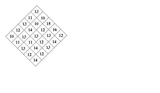 Các số ở mỗi ô trong hình thoi dưới đây biểu thị số lượng củ cà rốt. Chú thỏ đi từ góc dưới với 14 củ cà rốt và đi lên đỉnh trên với 13 củ cà rốt, chỉ được đi theo đường chéo, đi đến đâu ăn hết tổng số cà rốt trong ô đó. Hỏi rằng chú thỏ có thể ăn được nhiều nhất bao nhiêu củ cà rốt?